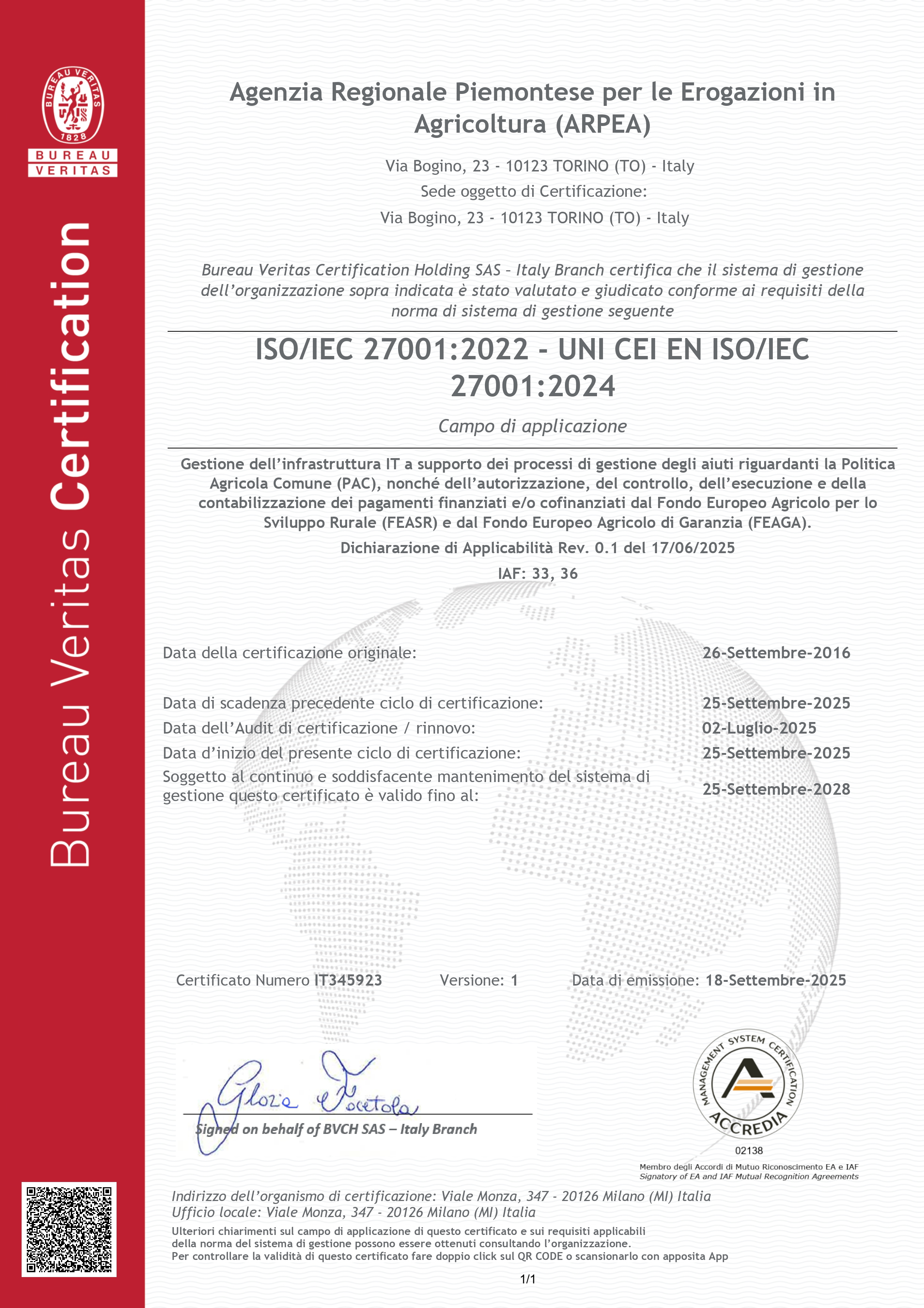 In data 26/09/2016 l’Agenzia ha ottenuto formalmente la certificazione ISO/IEC 27001